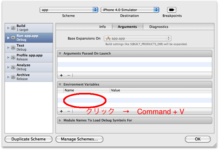 Debugでよく「NSZombieEnabled YES」などを使ったりするのですが、プロジェクトごとに毎回書くのがすごいめんどくさくなってきました。 で、ちょっと試してみたところ、少しだけですが入力を簡略化できることがわかったのでメモっときます。 ■debug用コマンド簡単入力