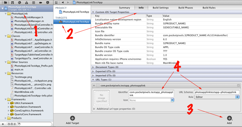 - アプリ情報を書く ソースにくっついてきたphotoapplink_debug.plistをxcodeで開き、書いてある他のアプリの情報を参考にしながら自分のアプリの情報を追加します。 指定可能キーとその概要はこんなかんじです。