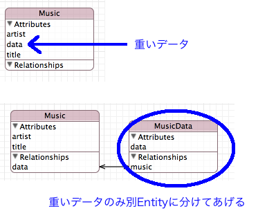曲自体の音データは非常に重たいですが、TableViewに表示するときはその音データまでロードする必要はありません。 曲のタイトル、アーティストがわかれば十分なはずです。 しかし、CoreDataでは同じEntityのデータを別々に分けてロードする、という手法が取れません。 なので、曲の音データとタイトル等の情報を分けて保存してあげます。 データ量が多くてロードするのに時間がかかるカラムのみ、べつのEntityにしてしまうのです。