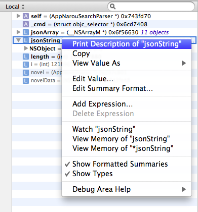- NSDicrionaryなど、変数パネルでは中身の値を直接見れない変数を見たいとき