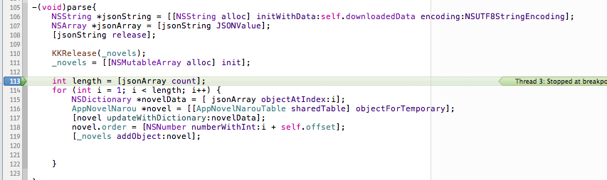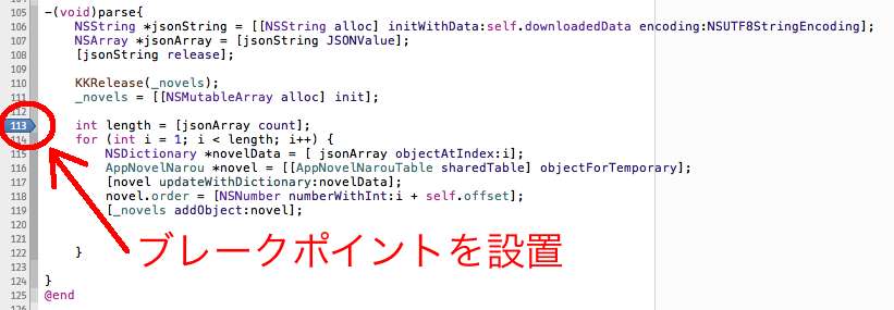 こちらのブログでそんなことができることを知り、結構便利だったのでここでも紹介します。 デバックの基本はNSLogで変数をコンソールに書き出すことです。 しかし、NSLogを書き忘れたり、追加したりしたくなるとそのたびに デバッグ停止→NSLogを書き加える→最初からデバッグを行わなければならなく、かなりめんどくさいです。 そこで、NSLogでの変数確認を”ソースに書く”ではなく、”気になったときに気になった変数の中身を出力する”方法を紹介します。