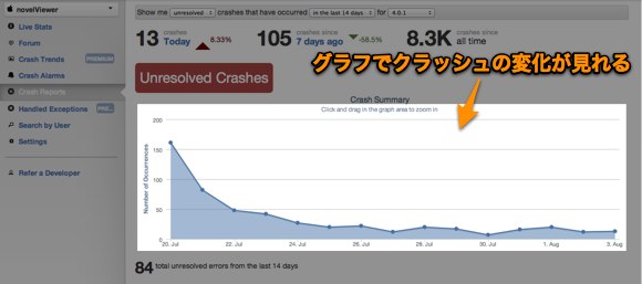 webで見ると,もっと詳細にいろんな統計が付いてきます. クラッシュ数の変化や、クラッシュしたデバイスの情報などです. クラッシュ数の変化