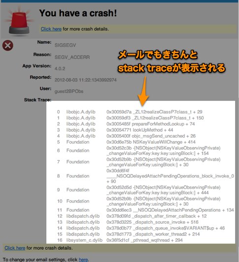 クラッシュした時,メールでエラーを見るのとwebで見るのの二種類があります. クラッシュ数が少ない場合はメールを,多い場合は統計してくれるwebがお勧めです. 飛んでくるメールはこんな感じにきちんとスタックトレースが付いてきます.